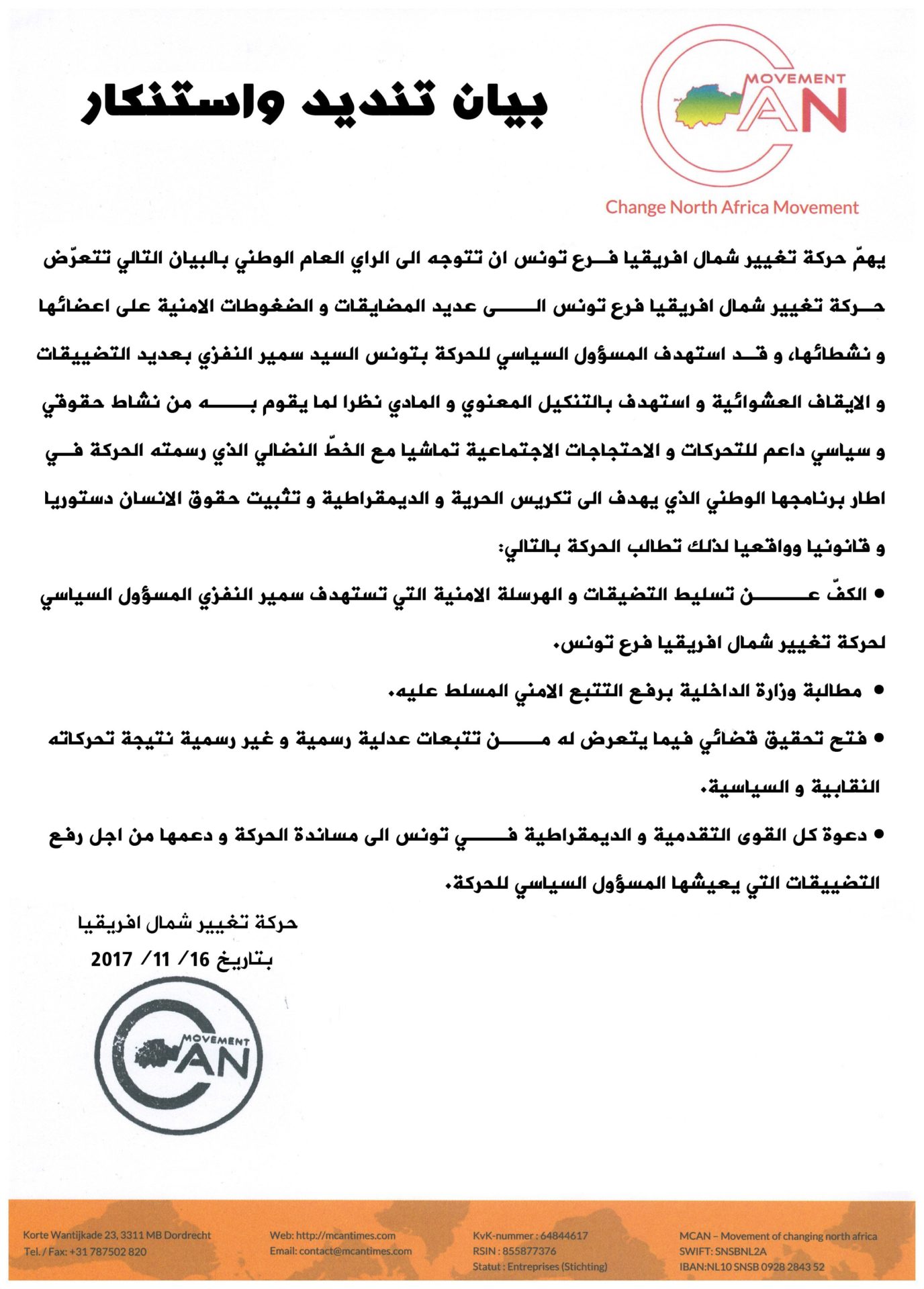 - الكفّ عن تسليط التضيقات و الهرسلة الامنية التي تستهدف سمير النفزي المسؤول السياسي لحركة تغيير شمال افريقيا فرع تونس.